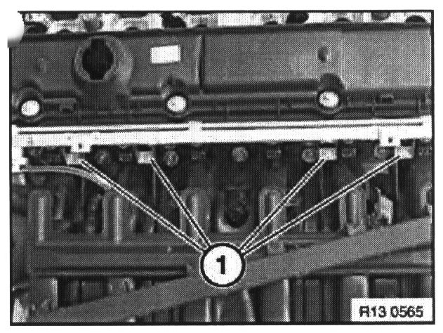 Release screws (1) and remove injection pipe with fuel injectors.