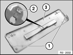 Catches (1) and (2) of base frame (3) for license plate must not be damaged.