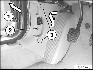 Push footwell trim (3) a little to rear (guides (3) are unlocked) and detach footwell trim towards inside.