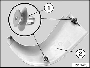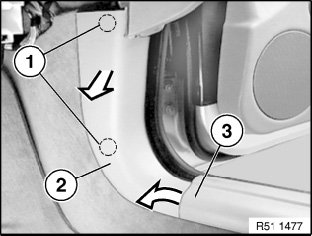 If necessary, replace faulty clips (1) in side trim panel (2).