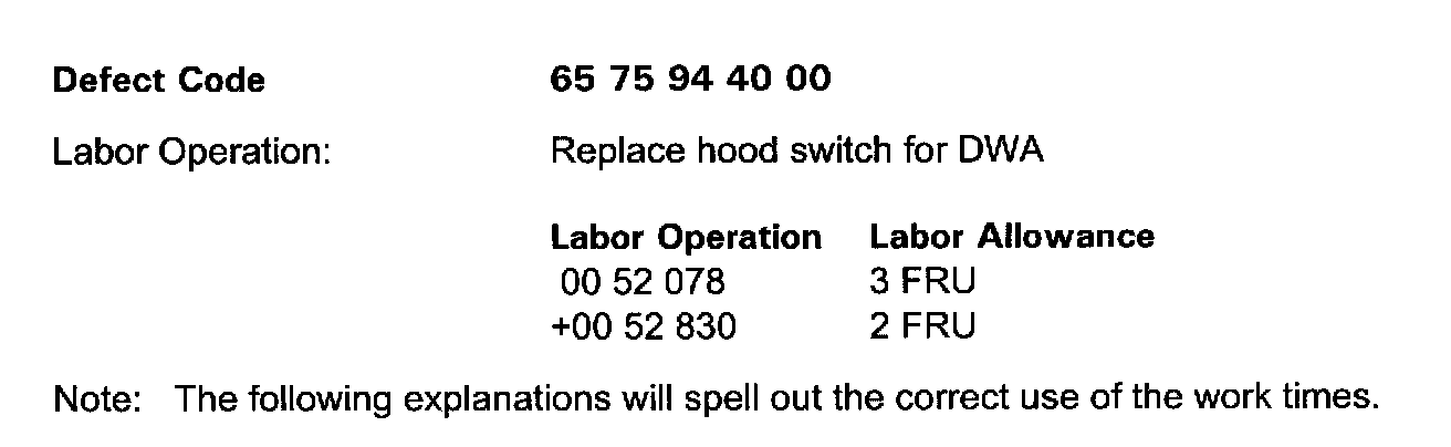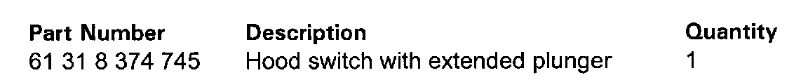 If the alarm was triggered by the hood contact, remove and replace the hood switch with new hood switch with an extended plunger. Refer to repair instruction 61 31 241