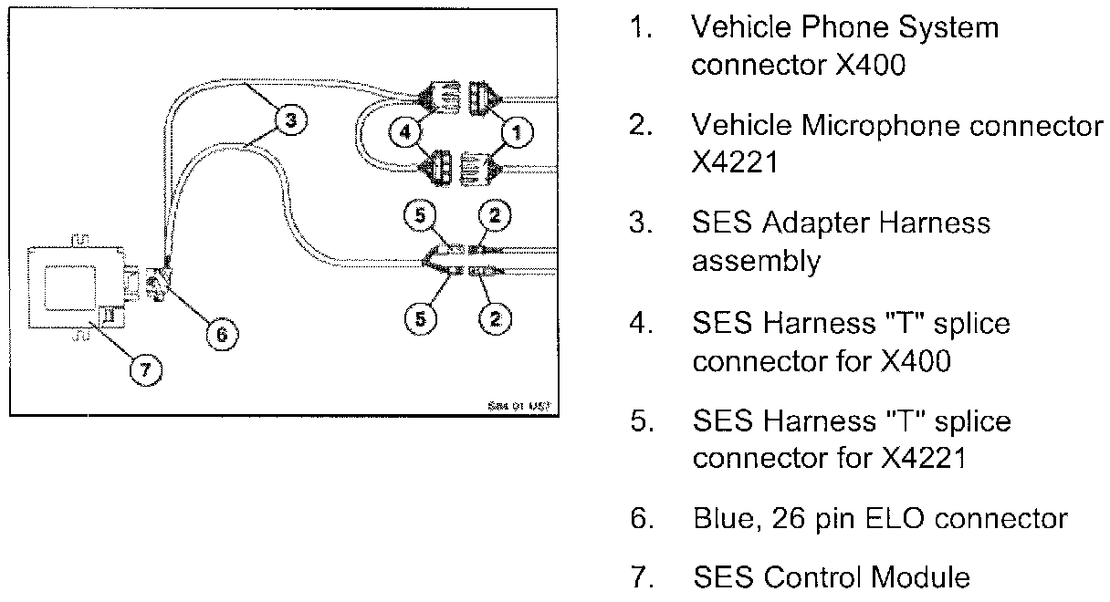 The SES Adapter Harness is electrically divided into two sections: one part provides two "T" connections that splice into the vehicle phone connector X400 and microphone connector X4221. The other section has a blue, 26-pin ELO connector for the SES Control Module.