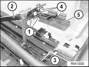 Slide control rail (1) backwards, lifting the linkage (2) and lifting lever (3) over the gasket (4).