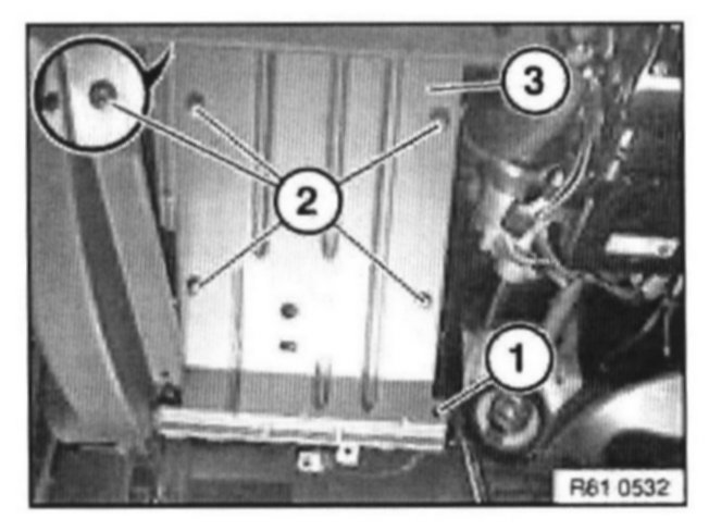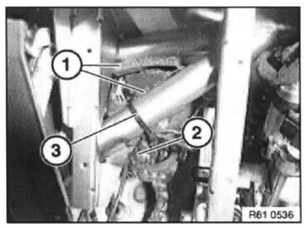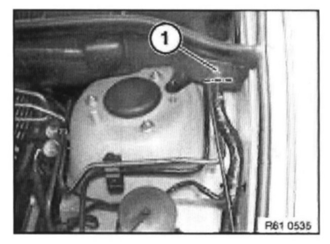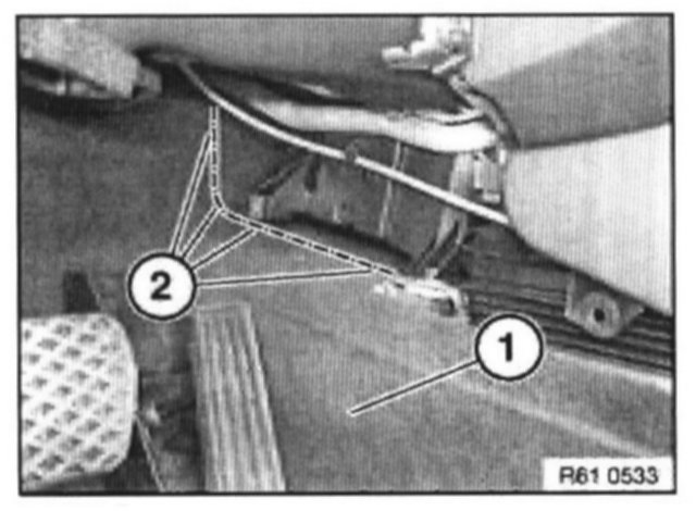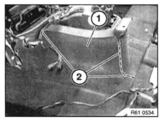 Cut through wiring harness (1) approx. 10 cm in before splashboard and pull back from inside into footwell. Detach cut wiring harness from engine compartment and remove.