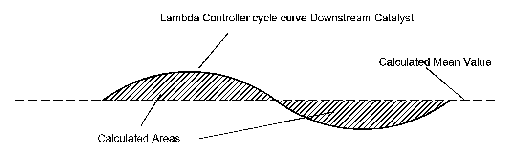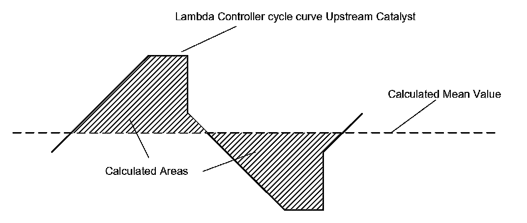 In order to determine the catalysts efficiency a fixed number of complete lambda controller cycles (oxygen oscillation from upstream sensor) are used to calculate the areas which are enclosed by the controller cycle curve and is also calculated mean value. The average of all areas displays the magnitude of the oxygen admission to the catalytic converter.