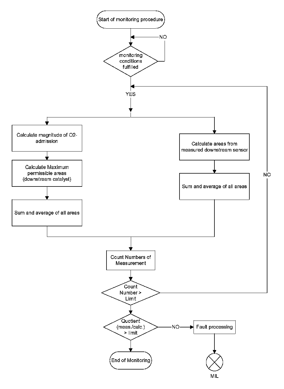 The magnitude of the oxygen admission is used to calculate the maximum permissible oscillation (areas of the cycle) of the downstream sensor of a still good working catalyst.