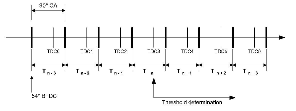 The segment periods are measured through an angular range of 90° crank angle. The segment starts 54° before TDC. The beginning and end of the segments are located at the same angle. The duration of the crankshaft segments is measured continuously.