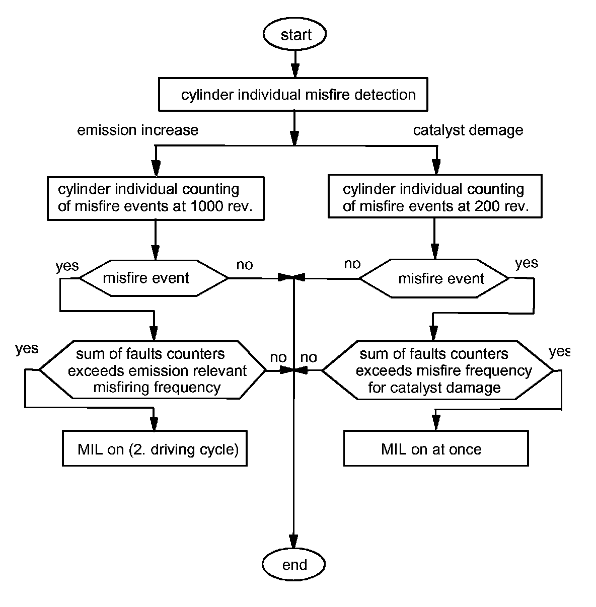 If the sum of cylinder misfire incidents exceeds a predetermined value a fault code is stored and the MIL is illuminated at once.