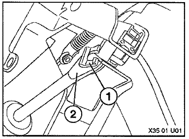 Remove the clip (1) holding the pivot pin in the pushrod (2), and remove the pin. Install a part number 64 50 8 390 601 "0" ring onto the pin and re-install the pin and clip.