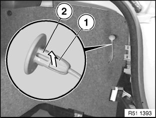 Partially lever out outer trim (1) and remove trunk wheel arch trim (2).