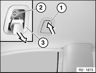 Release expansion rivet (1) and screw (2) at front of headliner (3).