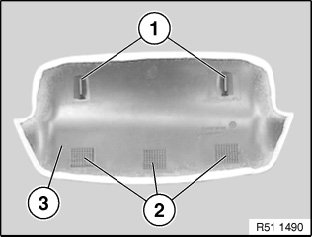 Press headliner (1) towards rear out of metal lugs (2) and remove towards rear left door.