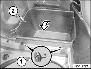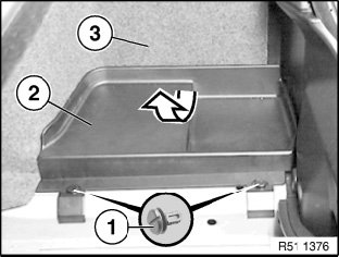 Turn rotary clip (1) through 90 ° and feed shelf (2) out of trunk wheel arch trim (3).