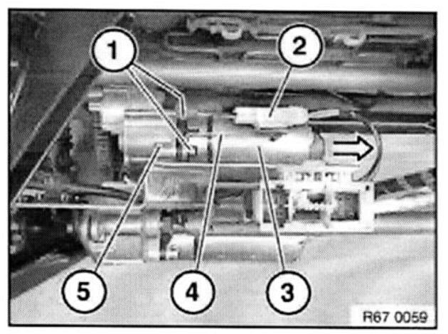 Remove drive for seat height adjustment (3) with fixture for plug connection (4) in direction of arrow from flange (5).
