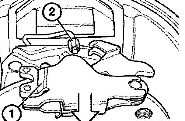 Pull expander lock (1) towards front, unhook handbrake cable (2) and remove expander lock.
