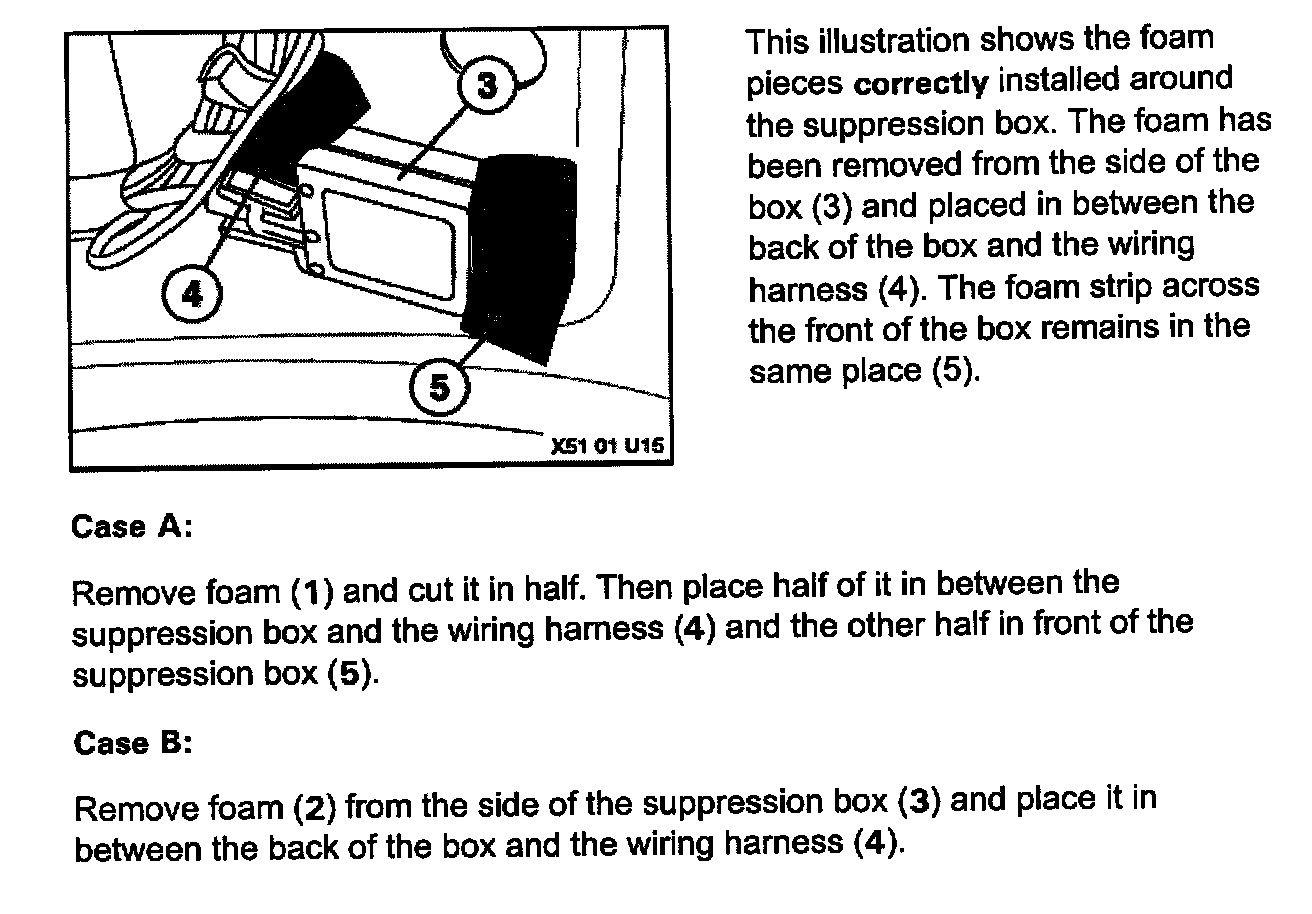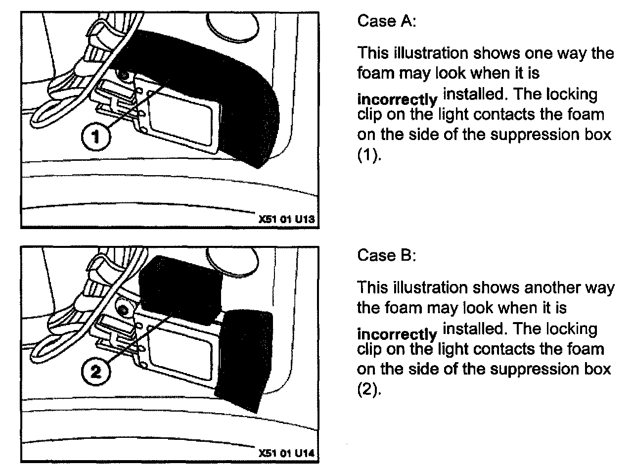 In case of customer complaint, the foam padding on the side of the suppression box should be moved to a different area. The foam should go in between the wiring harness and the suppression box. If the locking clip on the light is broken replace the light with part # 63 31 8 382 358.