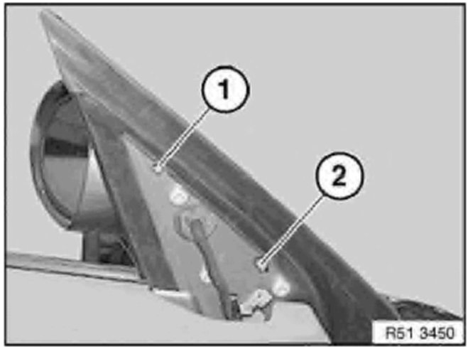 Unclip mirror triangle trim (1) at top out of catch (2) and feed out at bottom in direction of arrow from mounting (3).