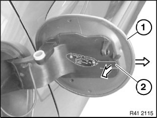 Lever out lock (2) and detach fuel filler flap (1) in direction of arrow.