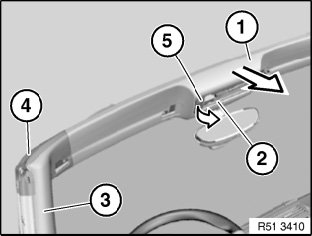 Pull back trim (1) in direction of arrow; if necessary, disconnect plug connection for hands-free microphone (5) and remove trim (1).