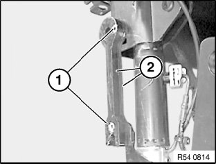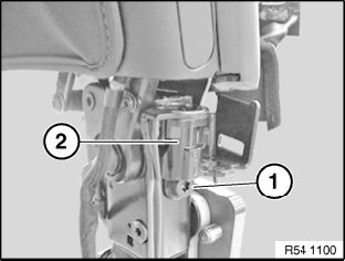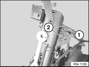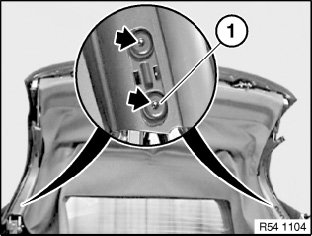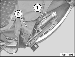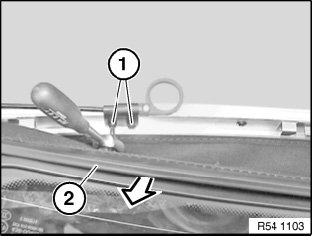 Feed out main bearing (1) with hydraulic cylinder (without hydraulic unit) between tensioning straps (2) and convertible top cover.