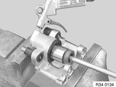 Blow up sleeve with compressed air (max. 3 bar). Sleeve jumps over brake piston.
