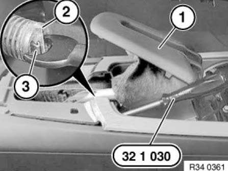 Use special tool 32 1 030 to press back the stop (2) of the adjusting spring until the restraining hook (3) snaps into place in the stop (2).