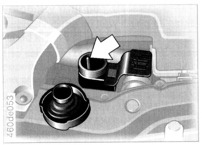 The coolant level is correct when the end of the red float is aligned with the upper edge of the filler opening (refer to the arrow in the illustration), or max. 0.8 in (2 cm) higher, that is up to the second mark on the float (see also the schematic diagram next to the filler opening).