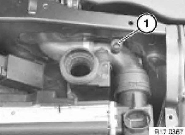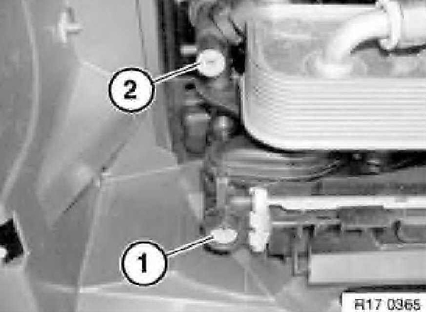 Open drain plug (2) on expansion tank at bottom. Drain, catch and dispose of coolant.