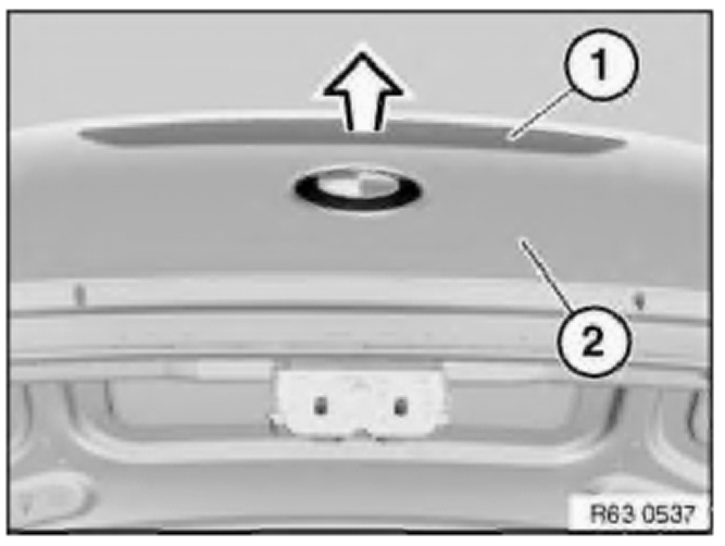 Pull auxiliary brake light (1) in direction of arrow out of rear lid (2) and remove.