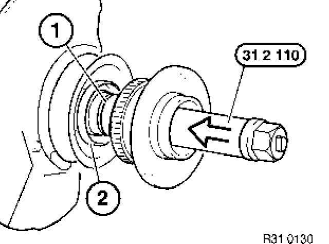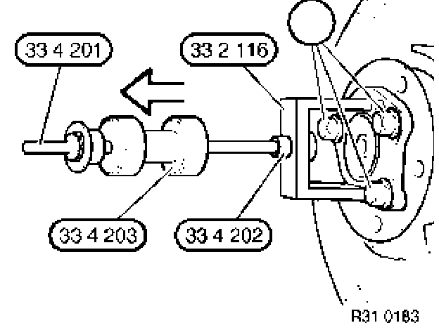 Remove bearing assembly with special tools 31 2 116 / 33 4 201 /33 4 202/33 4 203 and wheel studs (1).