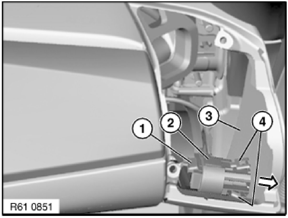Unlock catches (4) and feed switch for front passenger airbag deactivation (2) in direction of arrow out of instrument panel trim (3).