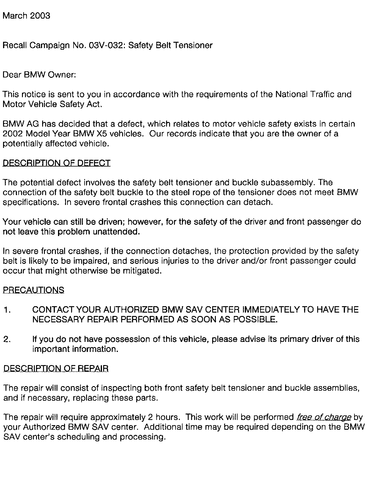 Recall - Safety Belt Tensioner Inspection/Replacement