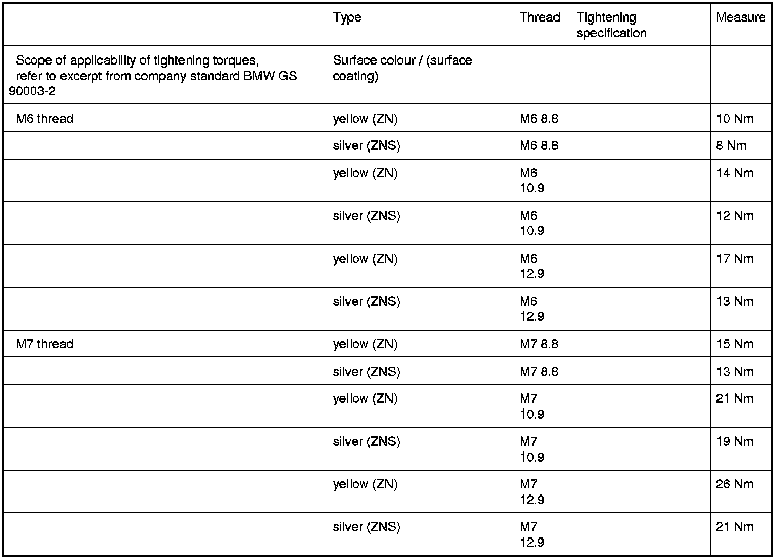 M6 and M7 - Maximum Tightening Torques Acc. to BMW GS 90003-2