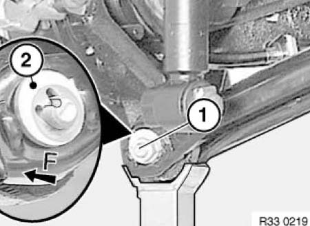 Release nut (1) on trailing arm and remove eccentric bolt.