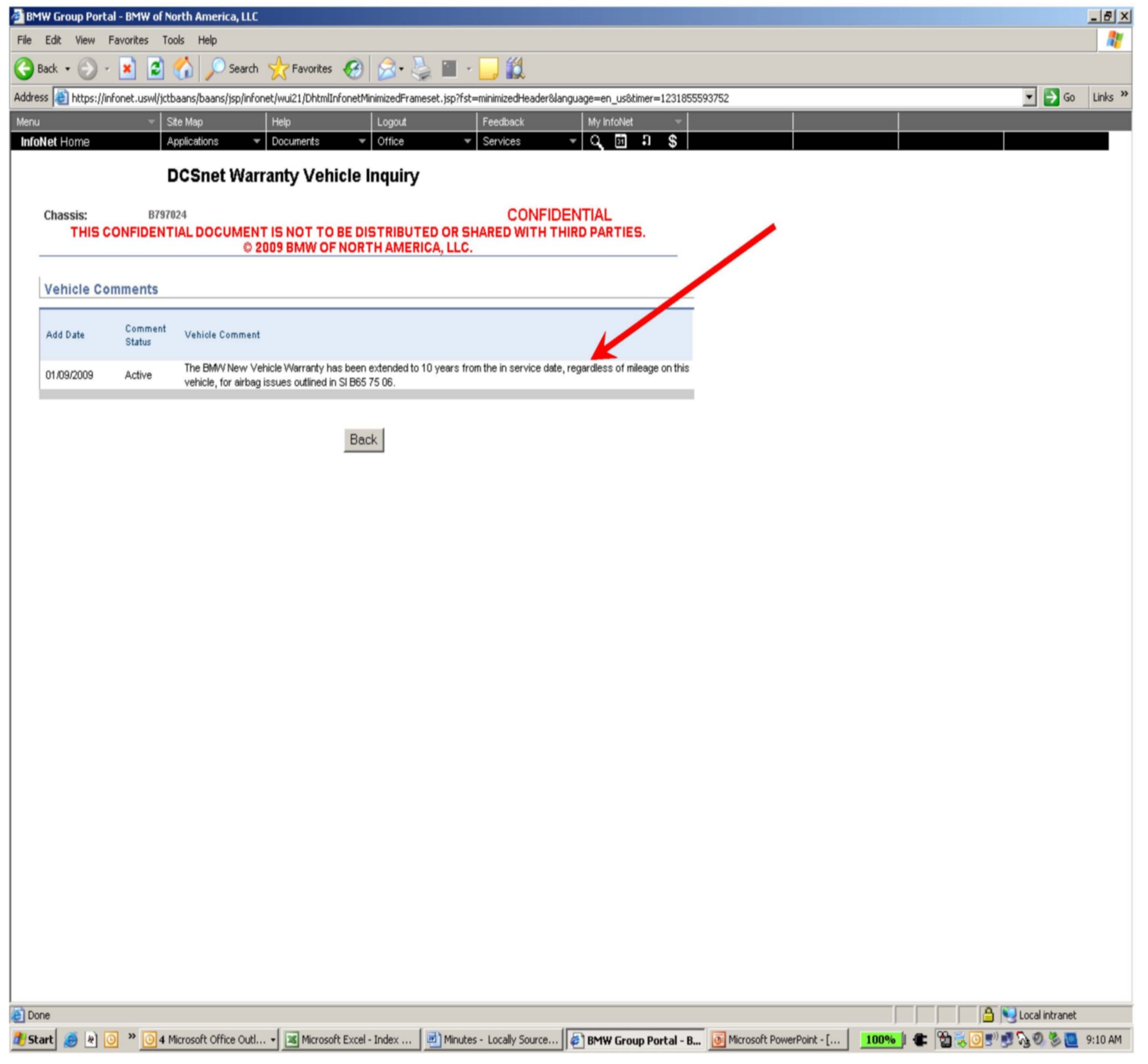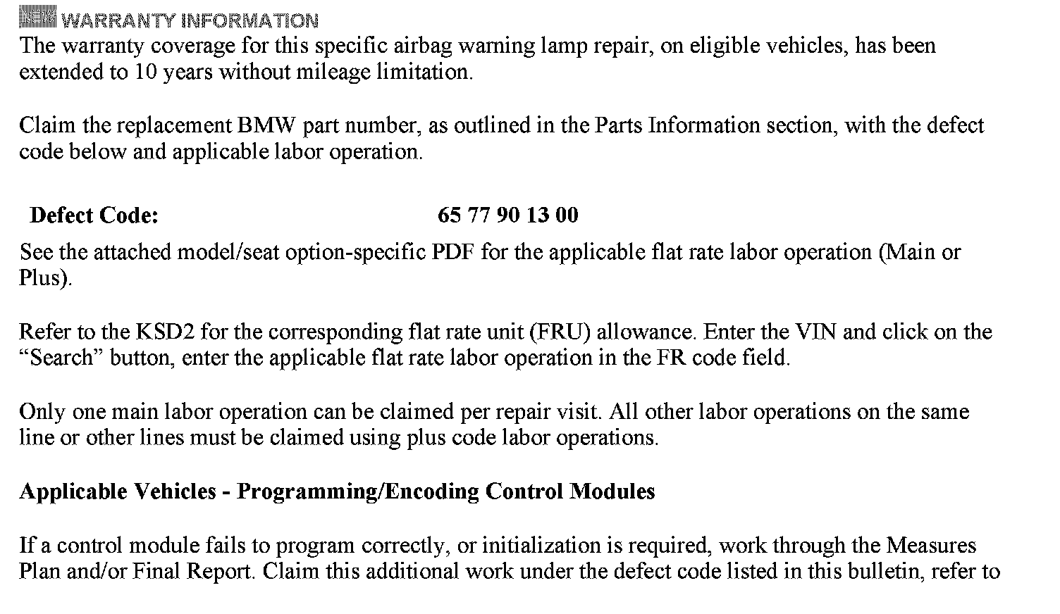 In the interest of customer satisfaction, the warranty coverage of the vehicle for this specific airbag warning lamp issue has been extended to 10 years without mileage limit. The letter in this bulletin is a copy of the letter that has been sent to the owners of all affected vehicles to advise of this change. Eligible vehicles will be shown in the DCS Warranty Vehicle Enquiry (see attachment).