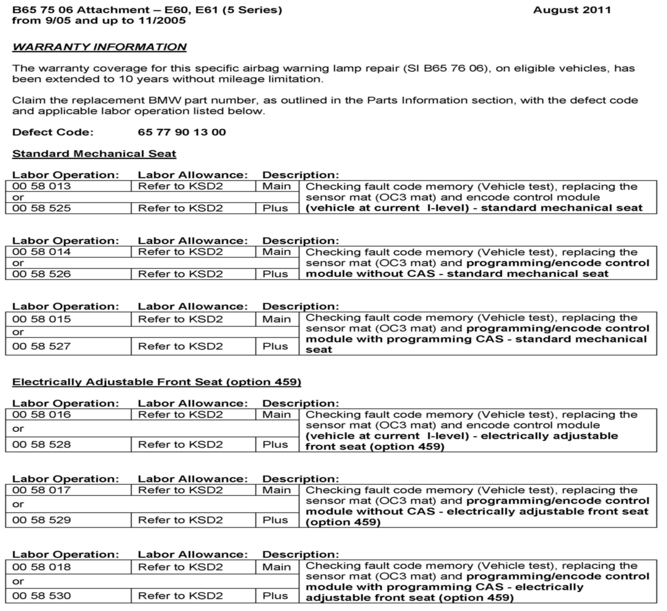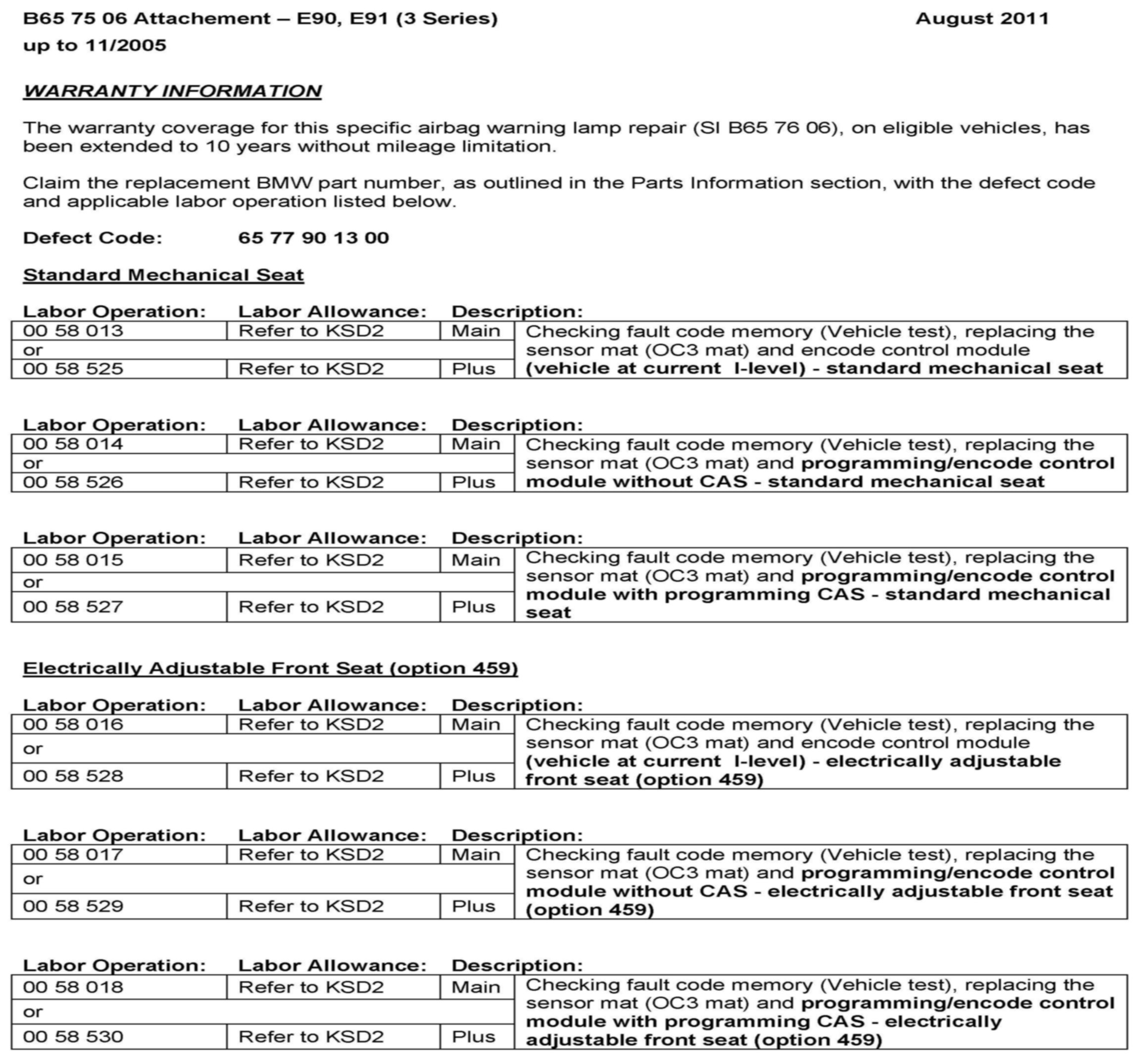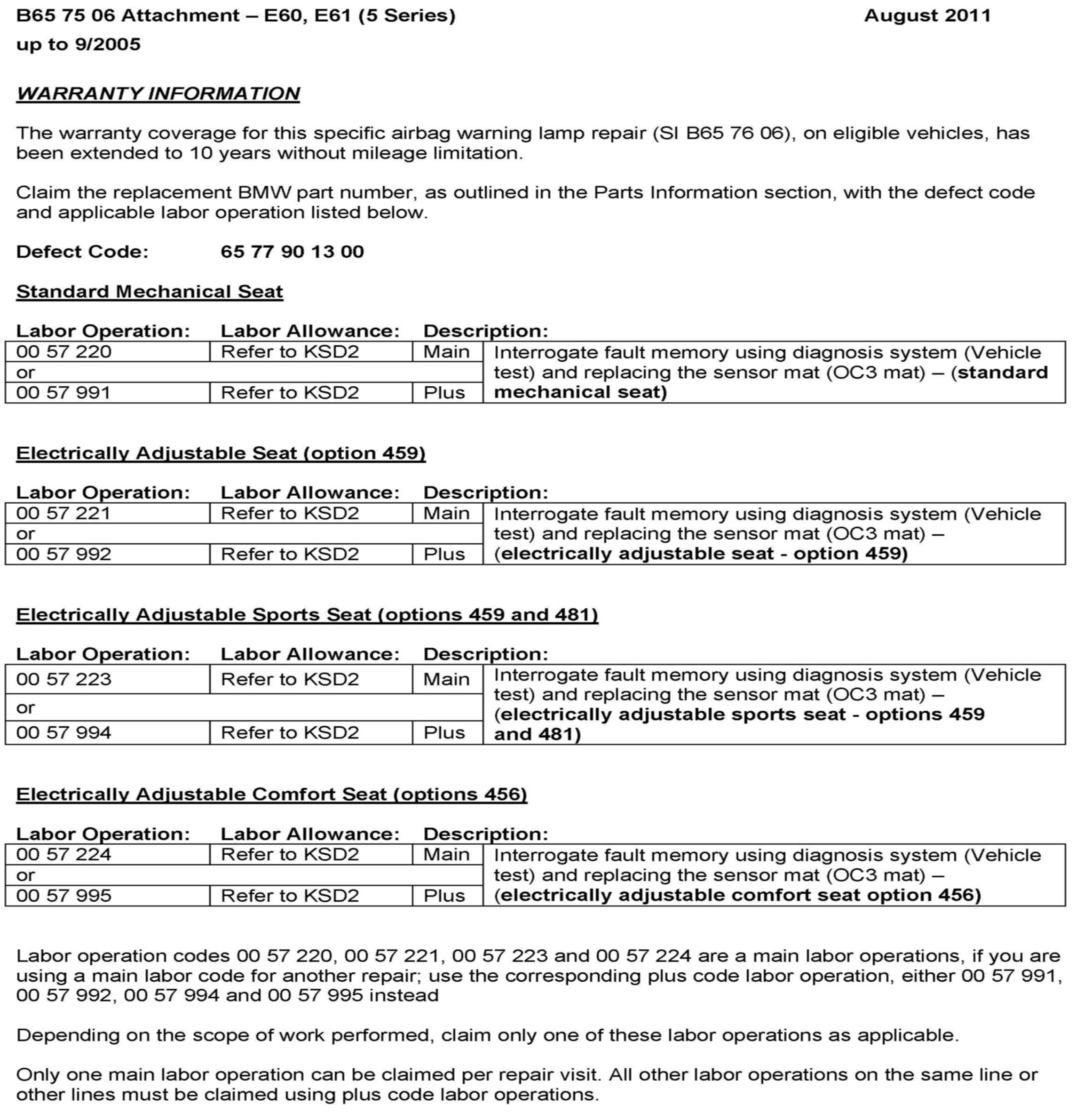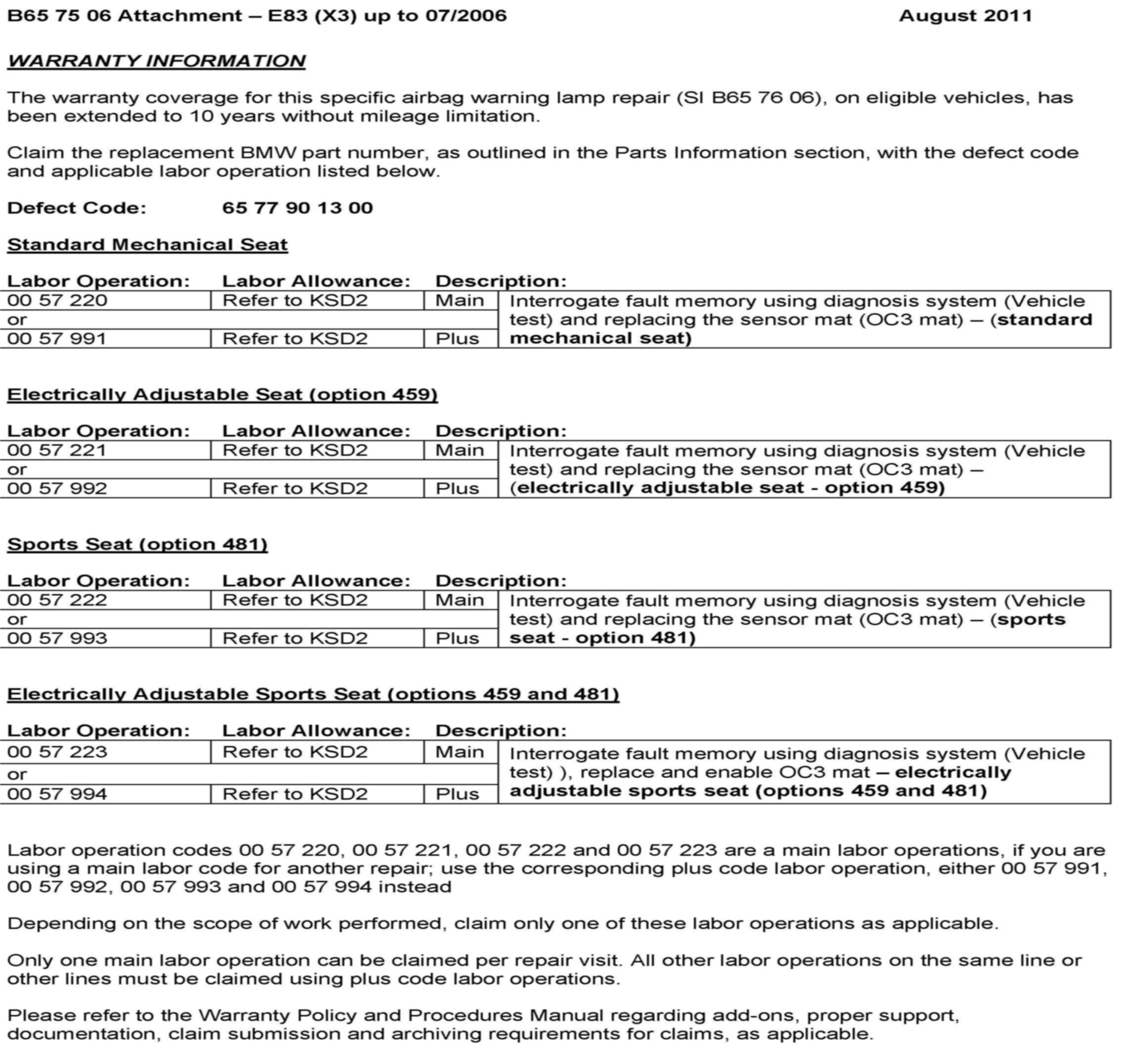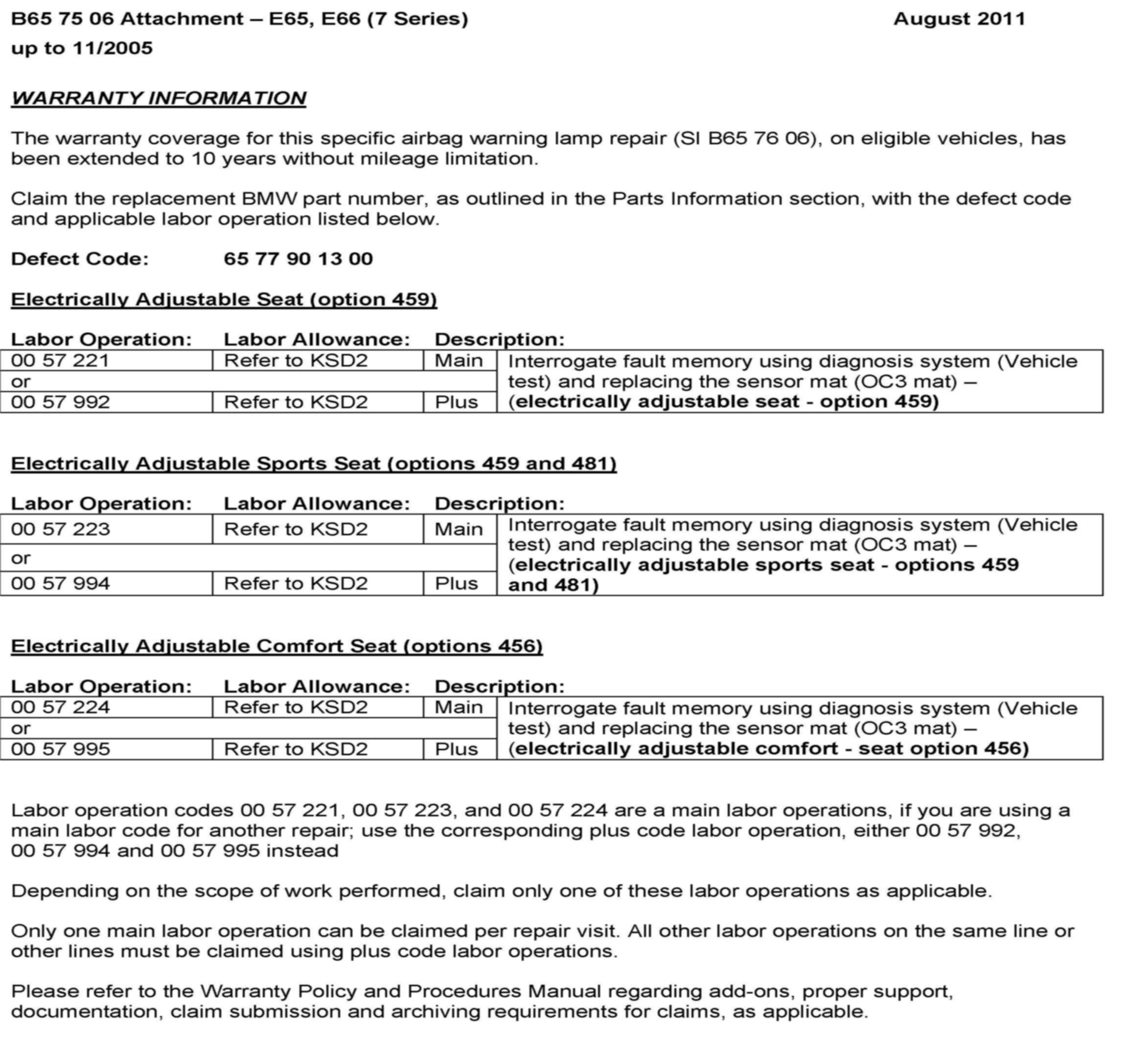 Note that: on E65 and E66 vehicles, the OC3 mat was introduced from 03/2004. Earlier vehicles had an SBE seat occupancy detection system. However, letters were mistakenly sent to owners of all vehicles up to 11/2005. Therefore BMW will honor this extended warranty for seat mat defects on the passenger SBE mat.