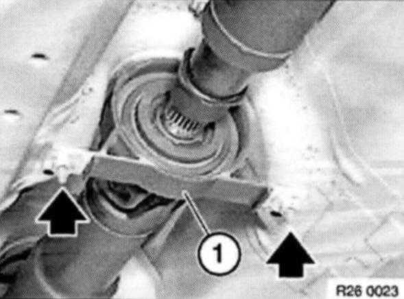 Bend propeller shaft downwards at center mount (1), detach from transmission output flange and tie back to one side on underbody of vehicle.