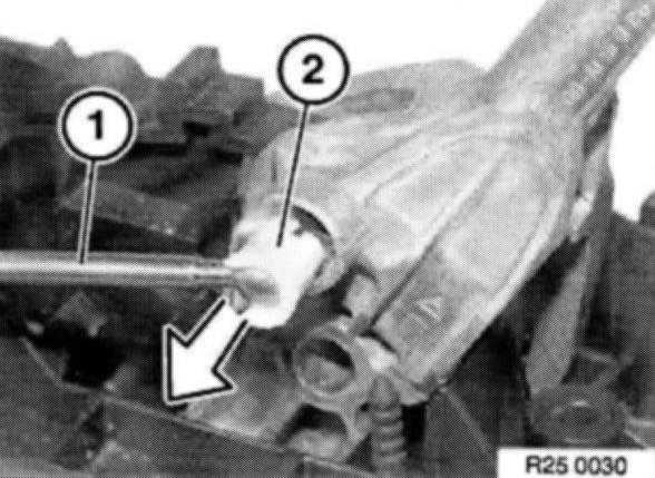 Remove cable (1) with rubber sleeve (2) from shift tower.