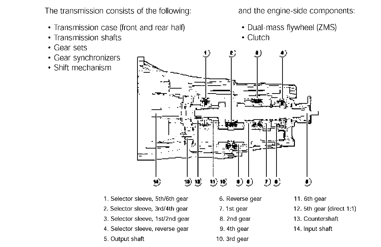 The gears are shifted by selector forks. The design dictates that the selector fork for 1st and 2nd gears is transmitted as follows: When the selector shaft is pushed forwards (engagement of 1st gear), the selector fork forced is multiplied as it moves backwards to engage 1st gear.