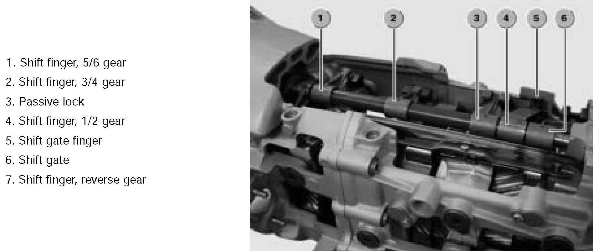 A further function of the shift gate and the shift gate finger is to absorb misuse forces created by the driver at the gearshift lever (previously transmitted via the selector shaft to the selector forks). A reduction of selector forces is achieved by low pretension springs at the 5/6 gutter, reverse gear and � gutter (helical coiled spring).