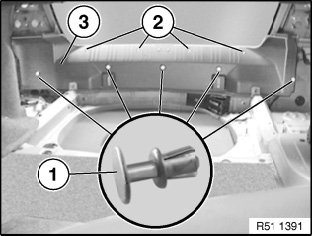 Turn rotary clip (1) through 90 ° and feed shelf (2) out of trunk wheel arch trim (3).