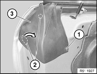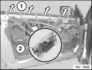 If necessary, remove faulty clips (2) from inner door panel and replace.