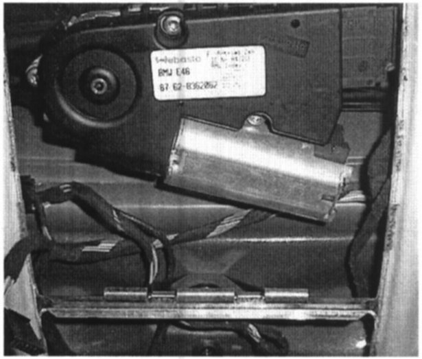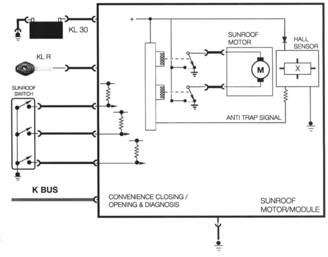 The sunroof is mechanically similar to previous systems. All of the electronic controls and relays are contained in the sunroof module (SHD). The module is connected to the K-Bus for comfort closing/opening, unloader signalling during engine startup, diagnosis and fault memory purposes.