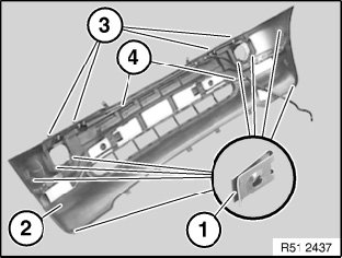 If necessary, feed hose (4) out of holders on bumper trim (2) and remove.