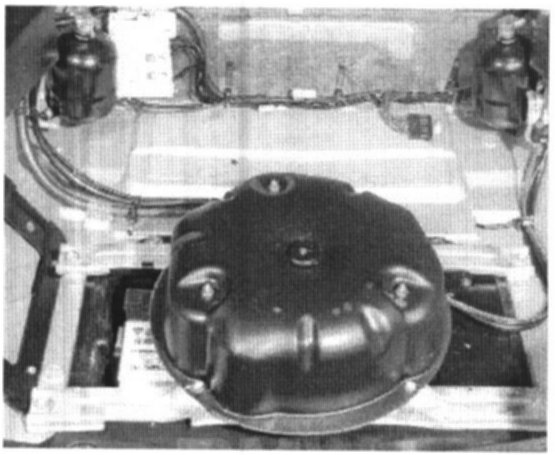 The full size spare tire is mounted below the load floor with the LVA air supply system for the air springs located beneath the spare.