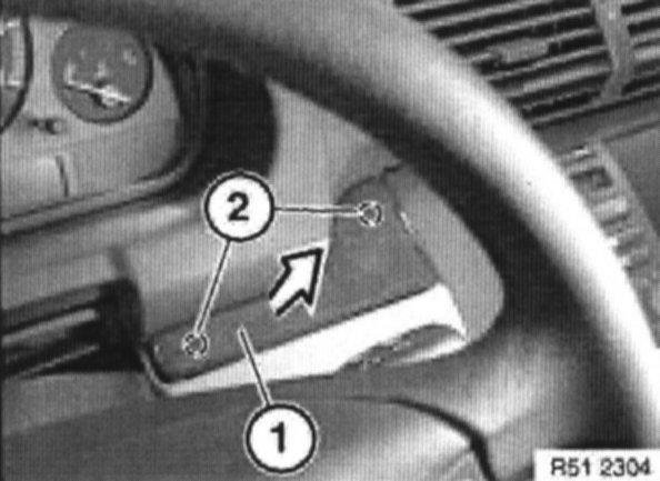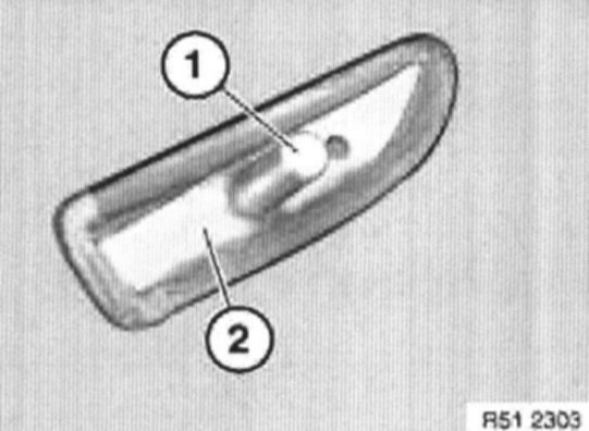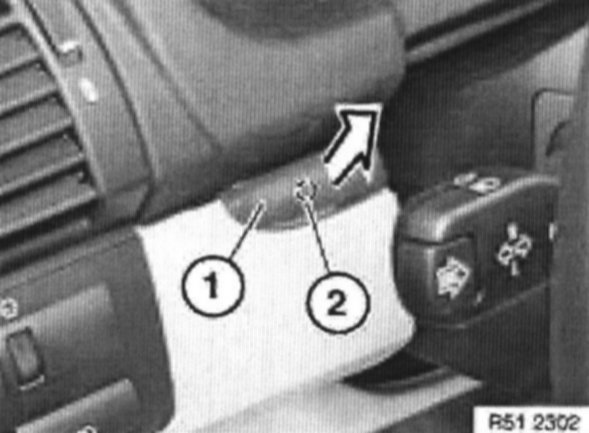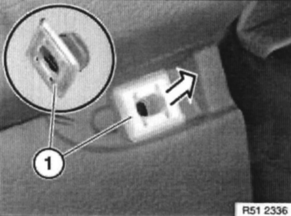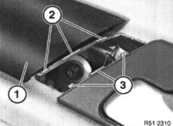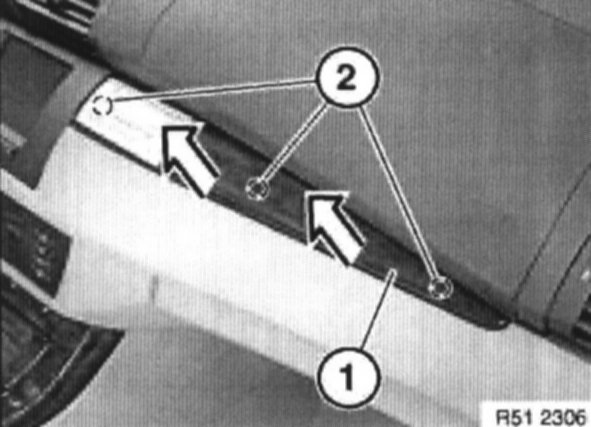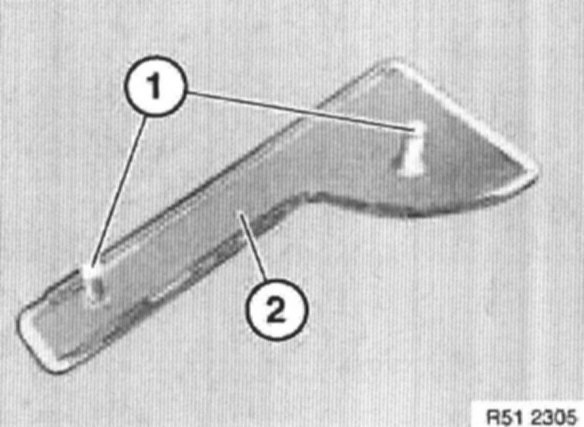Insert special tool 00 9 321 (fishbone) at side and unclip decorative strip (1) next to retaining pin (2).