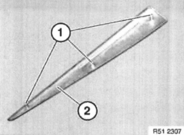 Insert special tool 00 9 321 at side and with second special tool 00 9 321 next to retaining pin (2) unclip decorative strip (1).