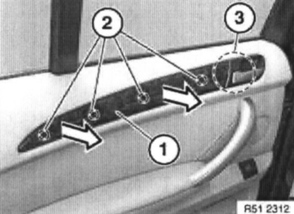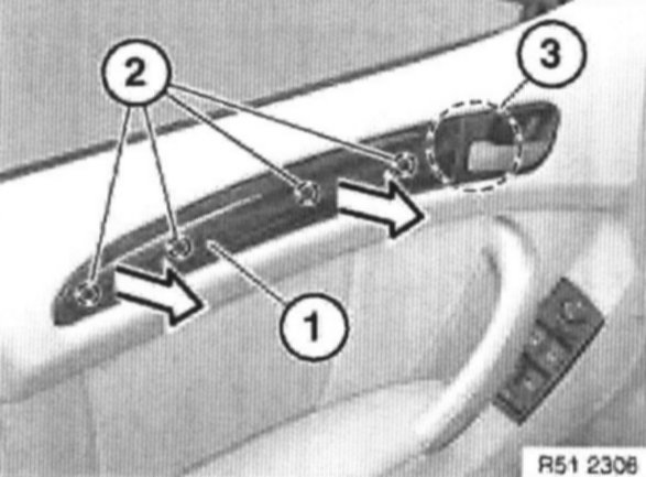 At front in area (3) of inside door handle, pull decorative strip (1) out of guides.