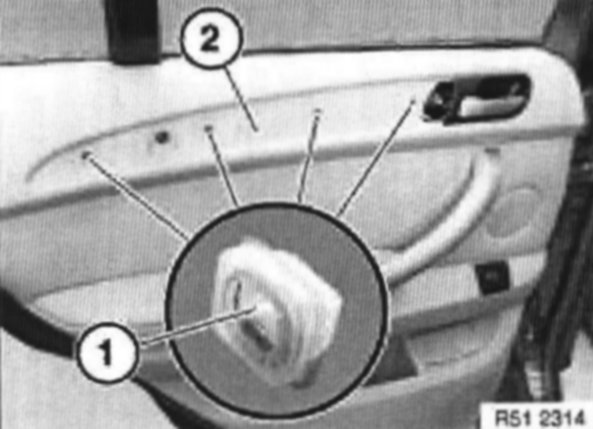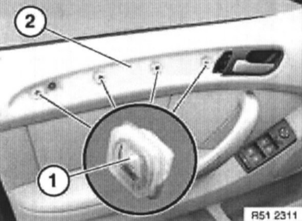 If necessary, replace faulty grommets (1) on door trim panel (2).