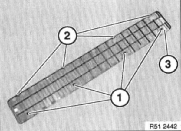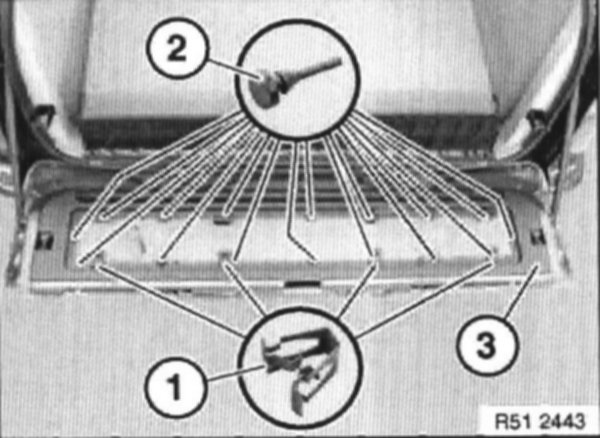 Lever rear insert (1) upwards out of retainers (2) and pull towards rear out of guides (3).